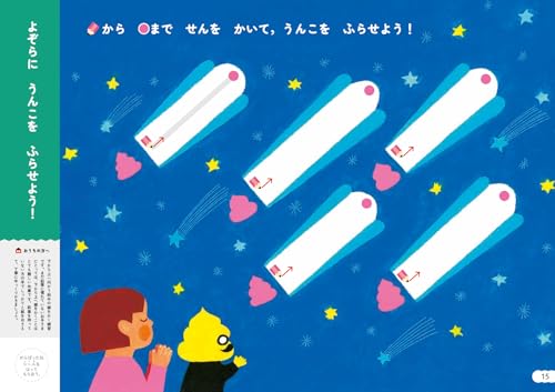 「鉛筆を持つこと」そのものに、まだ慣れていないお子さんのための、“運筆トレーニング”に特化した一冊。短い直線をなぞることから始まり、波線、丸へと、徐々にステップアップ。全てのページに、楽しいうんこが登場するので、子供は、お勉強をしている感覚ゼロで、夢中になって線を引きます。このドリルを終える頃には、お子さんは、鉛筆と“大の仲良し”になっていることでしょう。