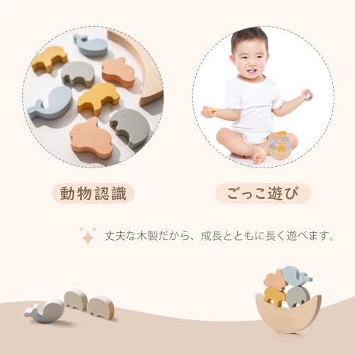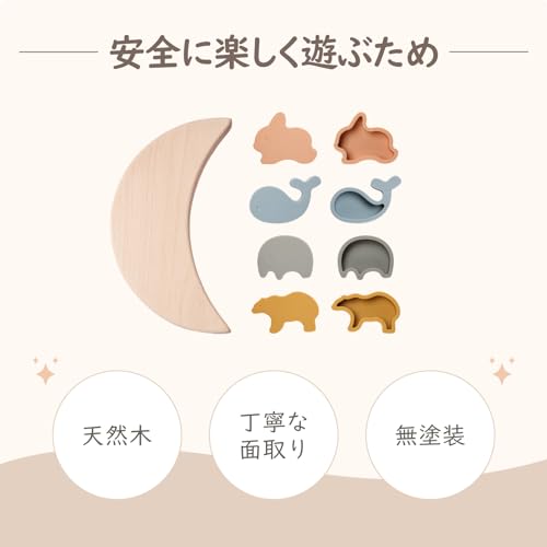 ゆらゆら揺れる三日月の土台の上に、ゾウさんやウサギさん、クジラさんの形をしたブロックを積んでいく、1歳頃から楽しめる優しい知育おもちゃです。最大の魅力は、その徹底した安全性へのこだわりにあります。
