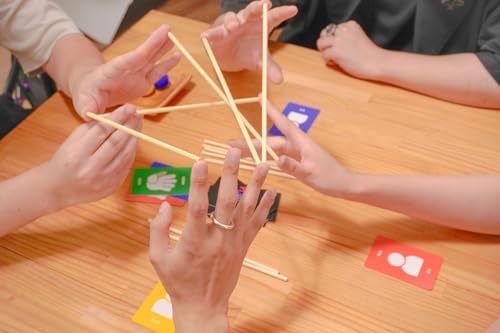 「体」そのものをゲームのコンポーネントにしてしまう、新感覚の協力型バランスゲームです。引いたカードの指示に従い、プレイヤー同士が「人差し指と親指で棒を挟む」「手の甲の上にボールを乗せる」といった形で、どんどん連結していきます。