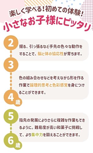 「こねる」「まるめる」「色を混ぜる」「形作る」。日本の伝統的な和菓子職人の技術を、家庭で、手軽に体験できるのです。