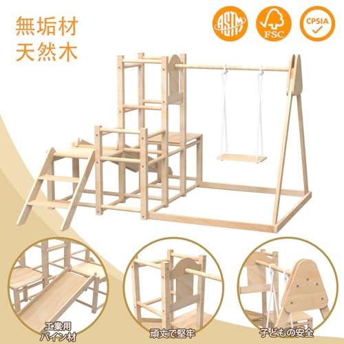 👑 おすすめ②:【おしゃれ&ナチュラル派に!】木製ジャングルジム 室内アスレチック 滑り台・ブランコ|温もりと安全性を兼ね備えた逸品!
