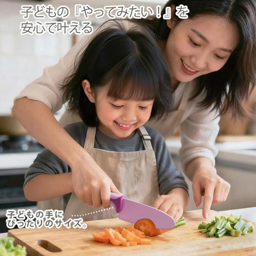 「0歳からのこども包丁」ですって!?しかも、手が切れないABS樹脂製なんて、究極に安全じゃない!これなら、もっと小さい頃からでも安心して渡せそうね!