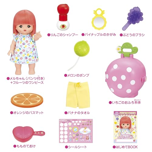 お風呂嫌いの子も、思わずお風呂に行きたくなる魔法のセット。お湯につけると、メルちゃんの髪がいちご色からレモン色に変化します!いちごのケースはバスタブと洗面台になり、泡風呂遊びも可能。お風呂の時間が、最高の遊びの時間に変わります。