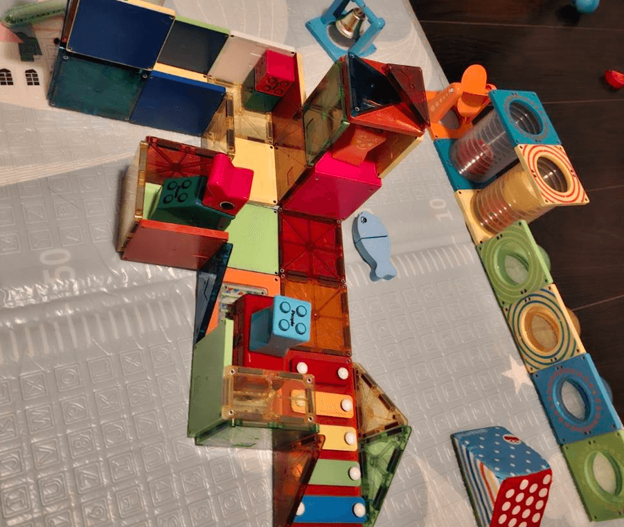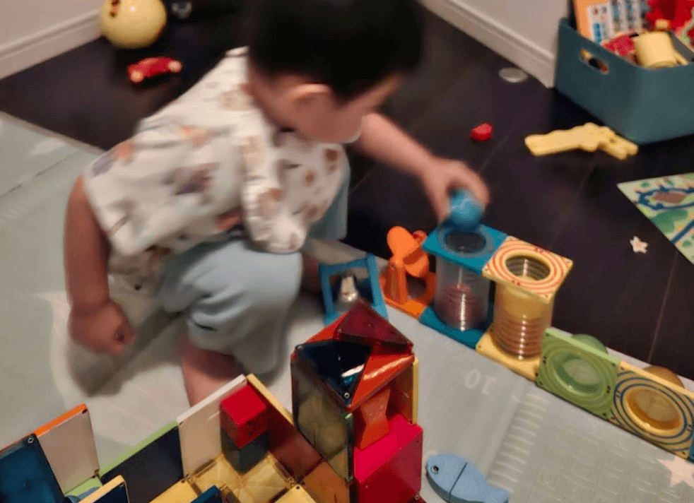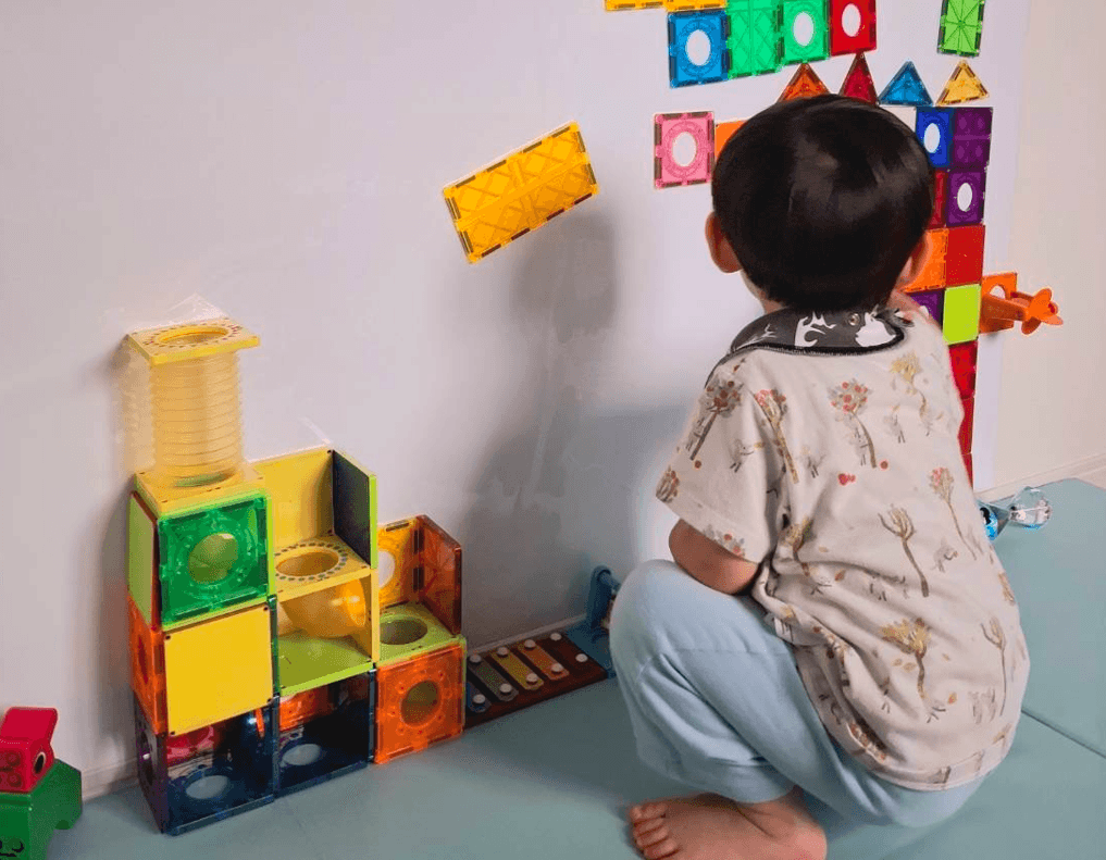 うんうん。で、実際に与えてみたら…もう夢中!最初はコースを作るなんて全然できなくて、ただひたすらプレート同士をカチカチくっつけたり、外したり。それだけでも、すごく集中して遊んでたよね。