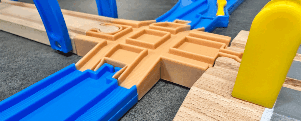 これは、ロマンの塊だな!プラレールの線路と、木製レールの線路を、“踏切”のように、十字に交差させることができるんだ!