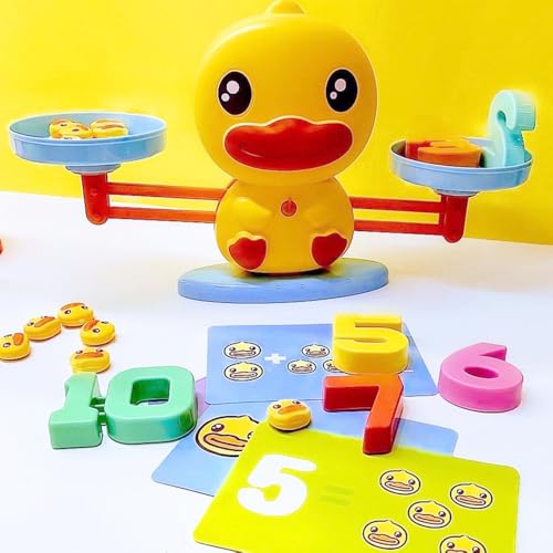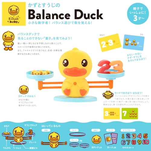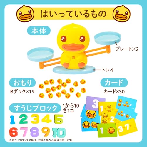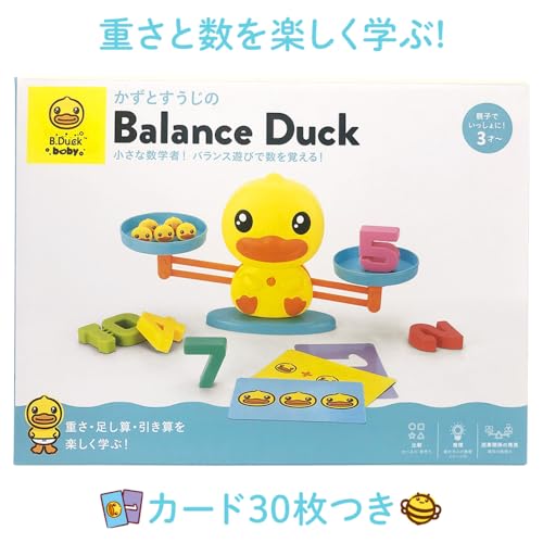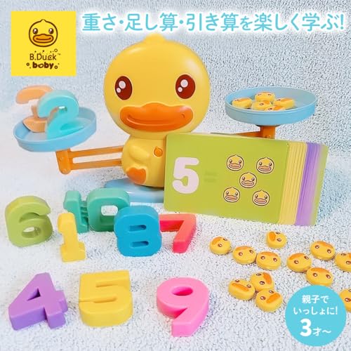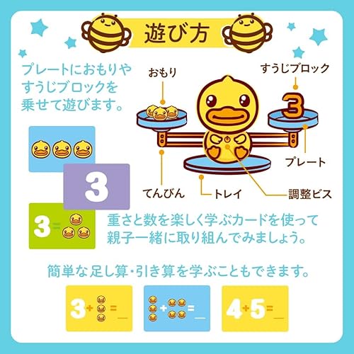 アヒルのデザインがユニークな天秤。数字ブロックだけでなく、1g単位のアヒルのおもりがたくさん付いているのが特徴。これにより、「数字の5」と「アヒル5匹」が同じ重さであることを体感でき、より具体的に「量」の概念を学べます。