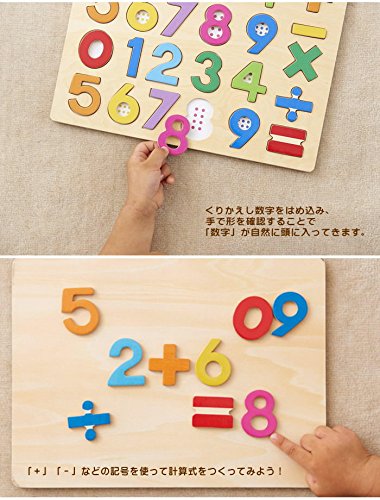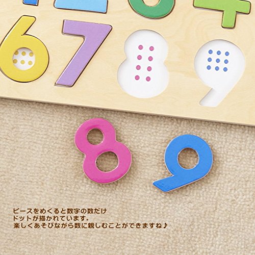 温かみのある木製のパズル。数字のピースを外すと、その数だけのドットが描かれており、「形」「数」「量」を自然に結びつけられる工夫がされています。
