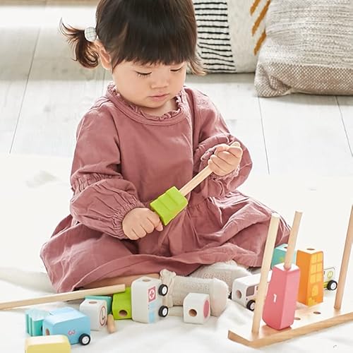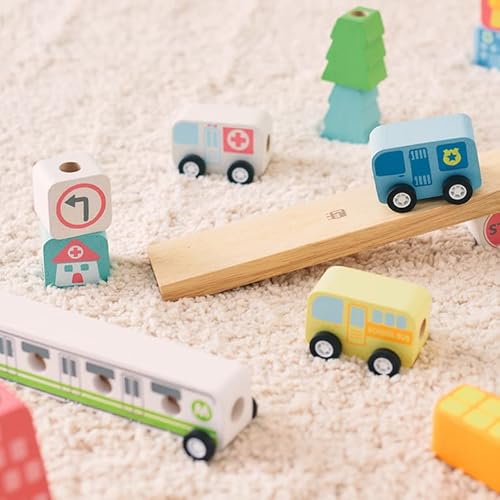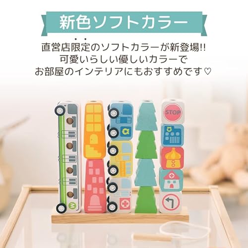 街をテーマにしたデザインが可愛い木のおもちゃ。棒通しだけでなく、車のパーツでごっこ遊びをしたり、紐通しをしたりと、一台で何役もこなす多機能性が魅力です。