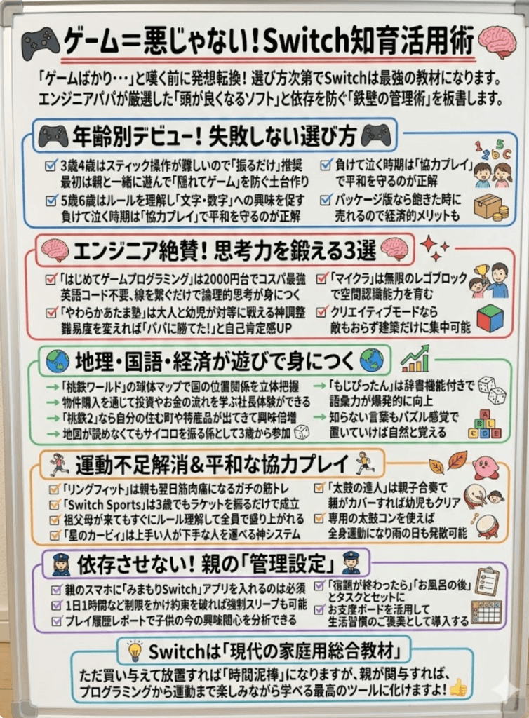 そう言いたくなる気持ちは分かります。しかし、選び方によっては、Switchが プログラミング教室や幼児教室以上の「最強の教材」 に化けることをご存知でしょうか?