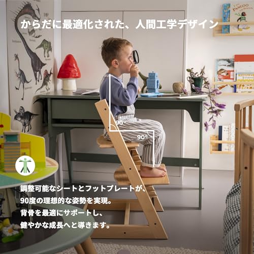 まず、トリップトラップが他の多くのベビーチェアと根本的に違うのは、「座面」だけでなく「足置き板」の高さも、ミリ単位で調整できることです。
